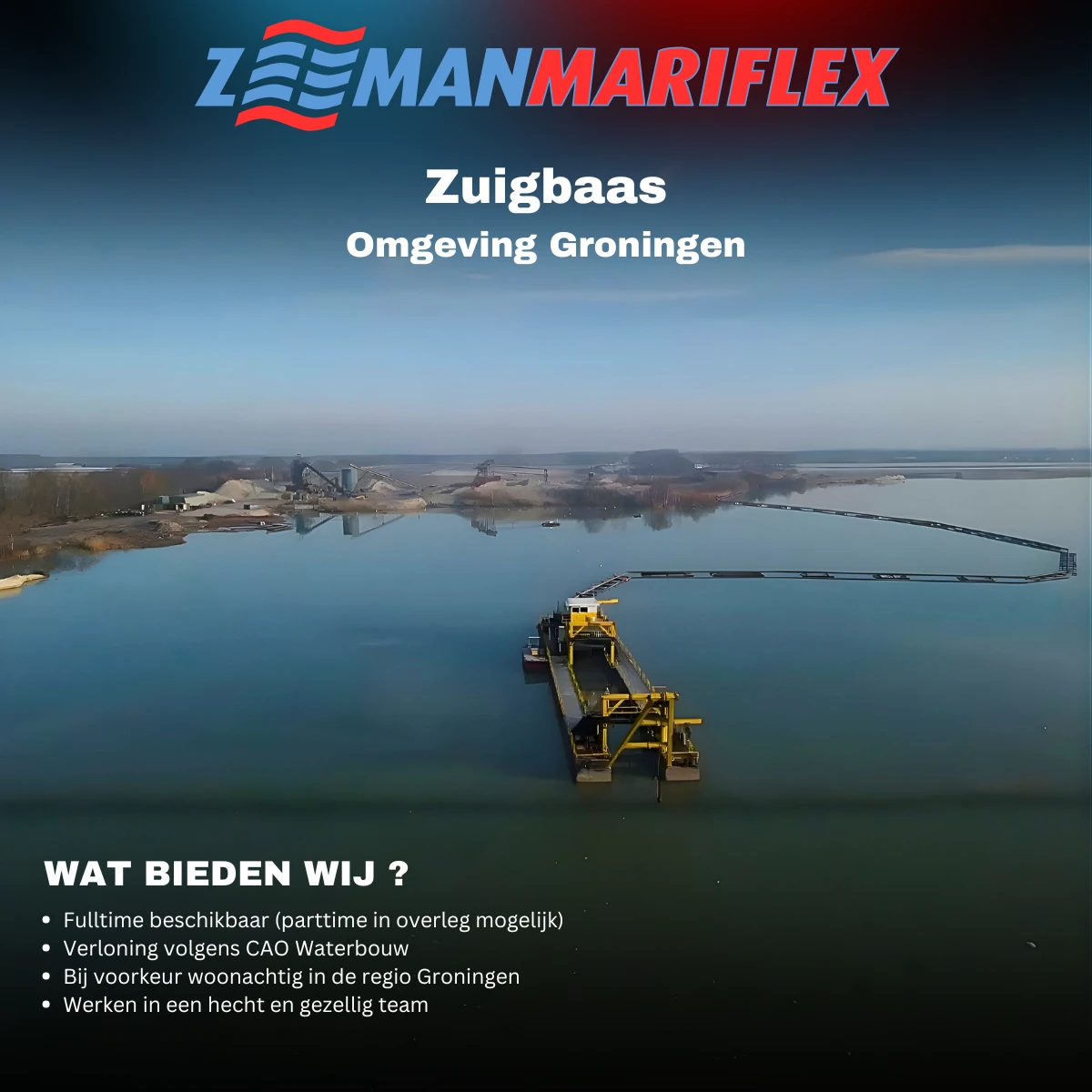 Voor onze zuigprojecten zijn wij op zoek naar een ervaren Zuigbaas. Werk jij graag aan boord, heb je verstand van zuiginstallaties en zoek je een stabiele baan binnen een hecht team? Dan komen we graag met je in contact.